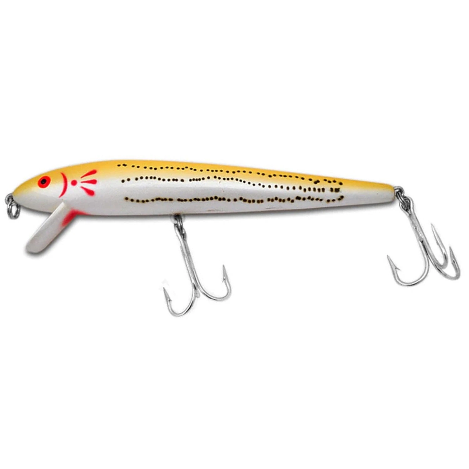 Cotton Cordell Red Fins are 7″ long and weigh 1 oz. They are available in Bone, Chrome/Black Back, Mother of Pearl, Pearl/Yellow and Purple /Black Back. They all work!